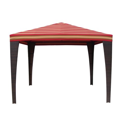 Cantina Gazebo in Espresso Rattan Patio Accessories by RST Outdoor model OP-PECAB10-CAN-PR gives your backyard the shady oasis you have been looking for. It is a semi-permanent structure measures 10 feet by 10 feet square. The corner posts are constructed of ultra durable, eco-friendly, recyclable, hand woven, polyethylene rattan wicker in a warm espresso color. The wicker is woven over an ultra-strong, powder coated aluminum frame in rich bronze finish. With a side clearance of six feet six inches even your tallest guests will move in and out comfortably. The canopy rises to a peak if eight feet six inches at the center for a lofty, spacious interior. The body of the canopy is made of crimson, Olefin fabric designed specifically for outdoor use. Olefin fiber is solution dyed then woven, allowing the fabric to retain color and vibrancy for years while resisting stains, mildew, fading, and abrasions. Your Cantina Gazebo is easy to maintain with mild soap and water. A perfect match to all the components of the RST Outdoor Cantina Collection.