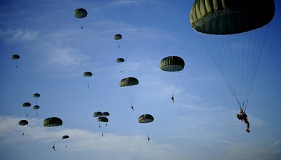 Soldiers Descend under a Parachute Canopy during Operation Toy Drop. - 18"W x 10"H - Peel and Stick Wall Decal by Wallmonkeys Feature